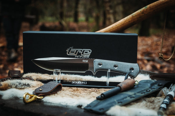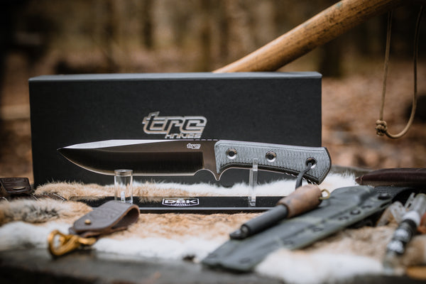 These have a true convex, rough black canvas micarta handle (will look more grey) and come with a Multicam camo kydex sheath!